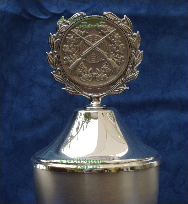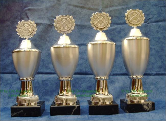 Pokale sind, abhängig von der Gestaltung, in verschiedenen Größen erhältlich. Gängig sind Pokale in den Größen von 20cm--50cm Höhe incl. Deckel. Die oben gezeigten Pokale sind (von links nach rechts) 27,5cm, 30,5cm, 31,5cm und 35cm hoch. Alle Größenangaben incl. Aufsatz. |