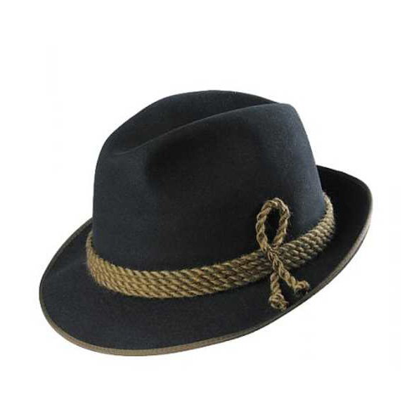 schwarzer Haarfilzhut mit grüner 4-facher Kordel und Einfass.